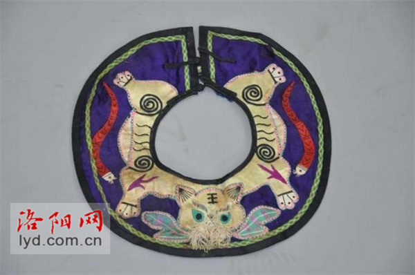 该围嘴直径24厘米,以紫缎为底,上绣有虎、蛇等纹样,虎身中间开圆形领口,用黑布和黄绿格纹布滚边收口,构图工整,刺绣技艺高超。儿童使用的围嘴绣有虎、蛇纹样,意在辟邪祛病、消灾免祸。