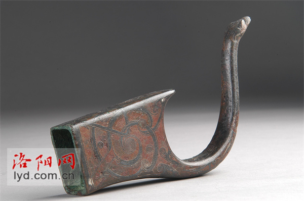 文物介绍:该器物长19厘米,呈蛇形,蛇头前伸,尾作方形筒,表面为错银卷云纹图案,制作十分精致。它是一种专门在战车上使用的装置,作为战车在行进时放置弓弩的固定支架。它的曲线造型设计恰好与弓弩造型相对应。在使用时,成对组合的承弓器正好承托住弓弩,同时弓弩的手柄部位靠在车上,弩机的尾端与承弓器两个拖点共同构成稳定的三角形。