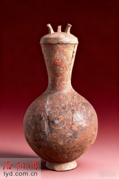 彩绘陶壶(汉代),洛阳出土,器身绘有红、黑彩纹饰,是汉代洛阳地区彩陶工艺的实物遗存,反映了汉代先民的艺术审美与生活风貌。拍摄于1984年3月。