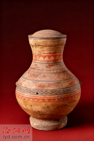 彩陶壶(汉代),洛阳出土,器身绘有红、黑彩纹饰,造型饱满,是汉代洛阳地区彩陶工艺的典型代表,反映了汉代先民的审美与生活风貌。拍摄于1984年3月。